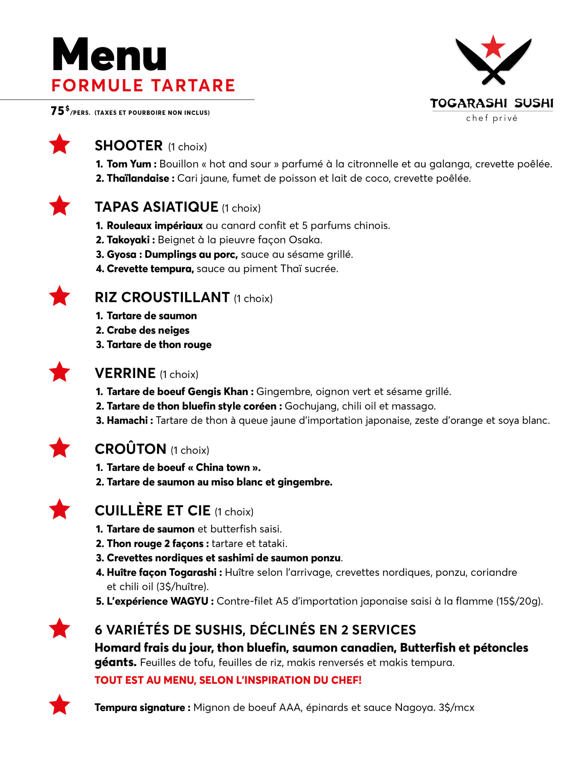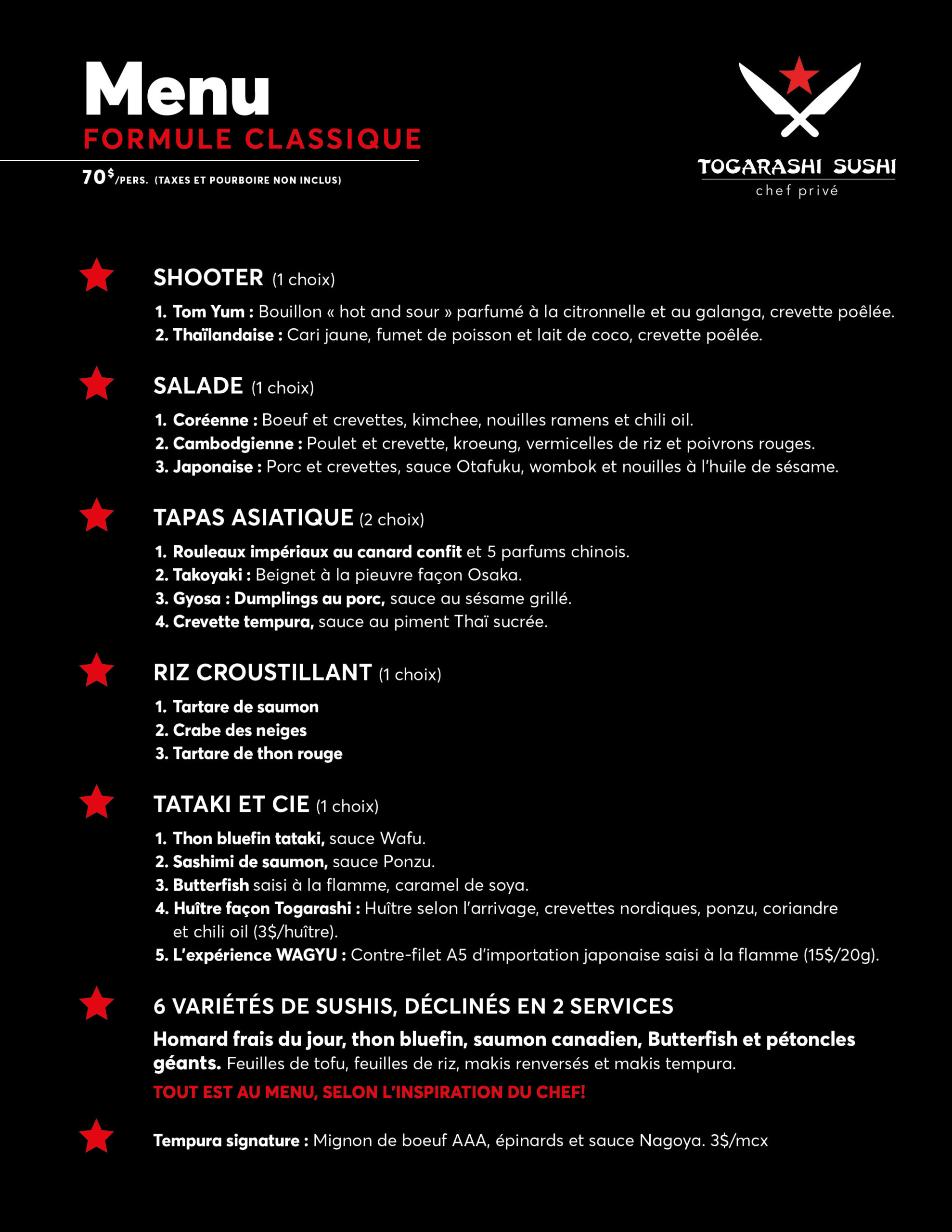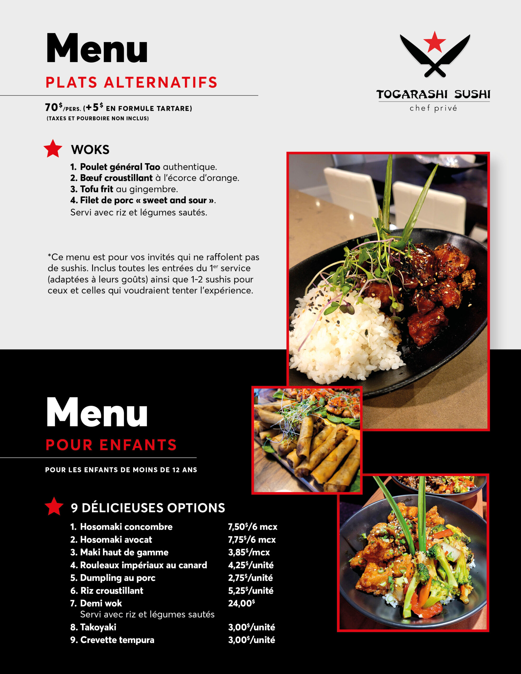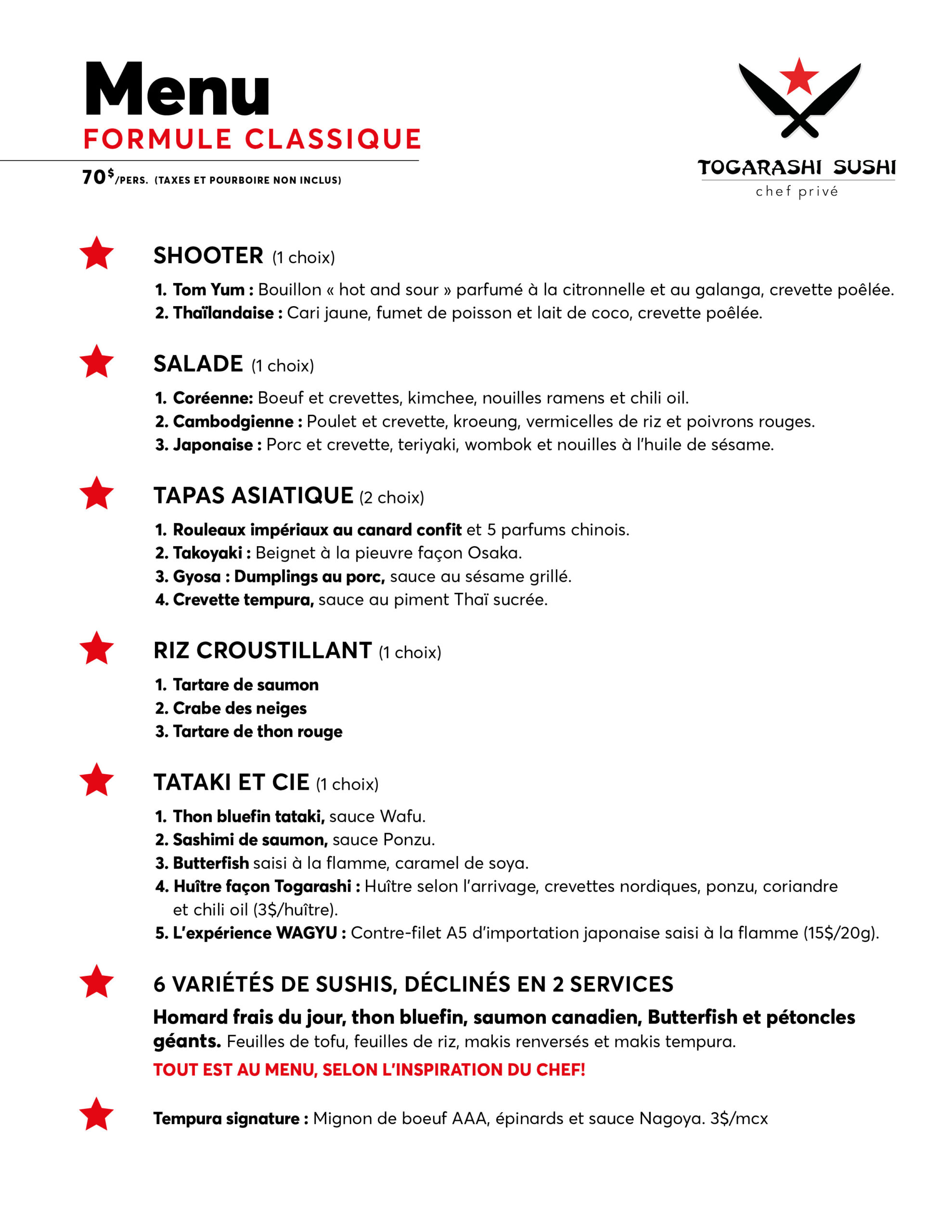 Togarashi Sushi est un service de Chef à domicile haut de gamme vous proposant des soirées sushis fait à partir de produits d’exceptions. Homard frais du jour, saumon canadien, thon Bluefin, crabe des neiges et pétoncles géants font parti de l’éventail de produits qui vous seront proposés. La conception du menu se fait avec vous et selon vos goûts.