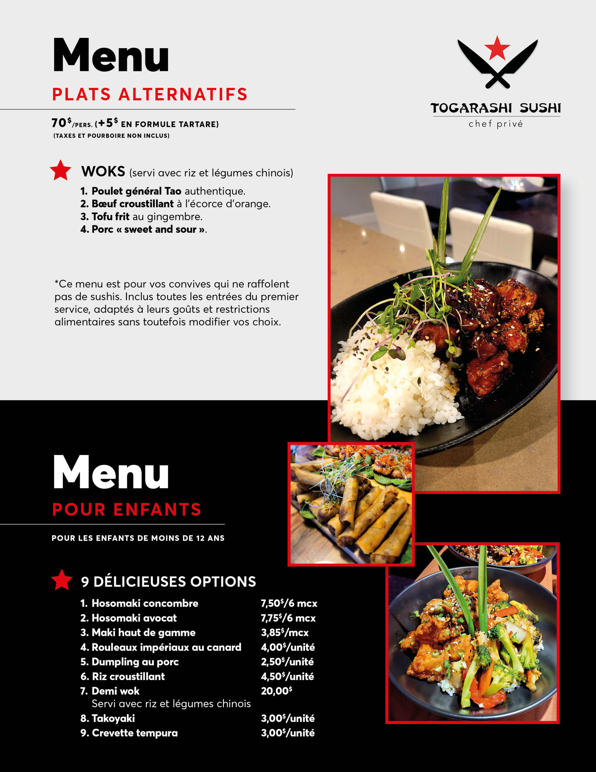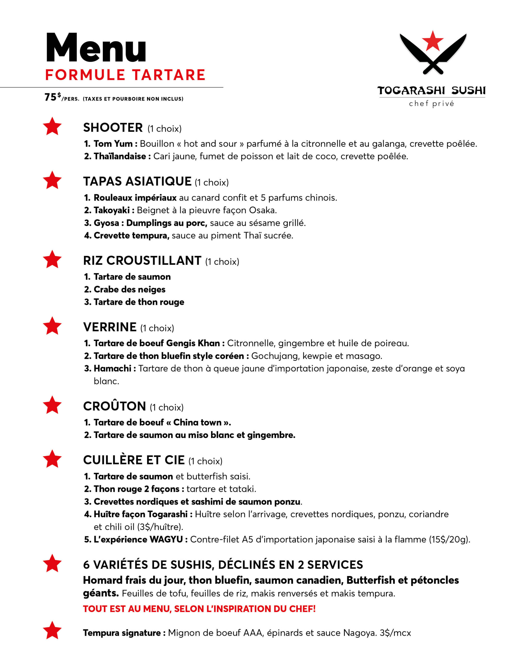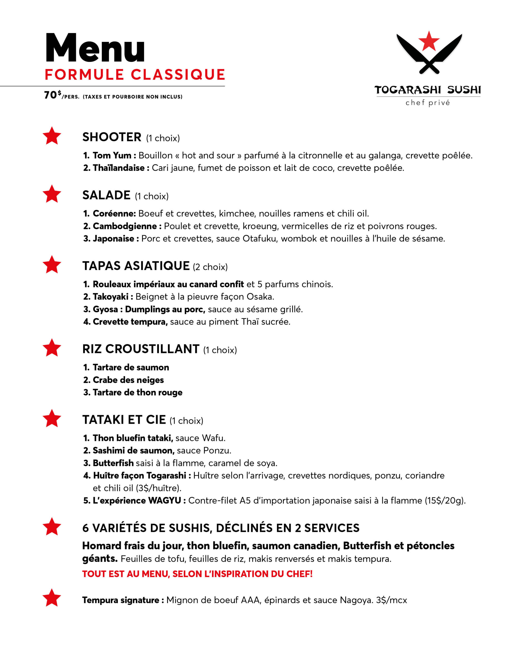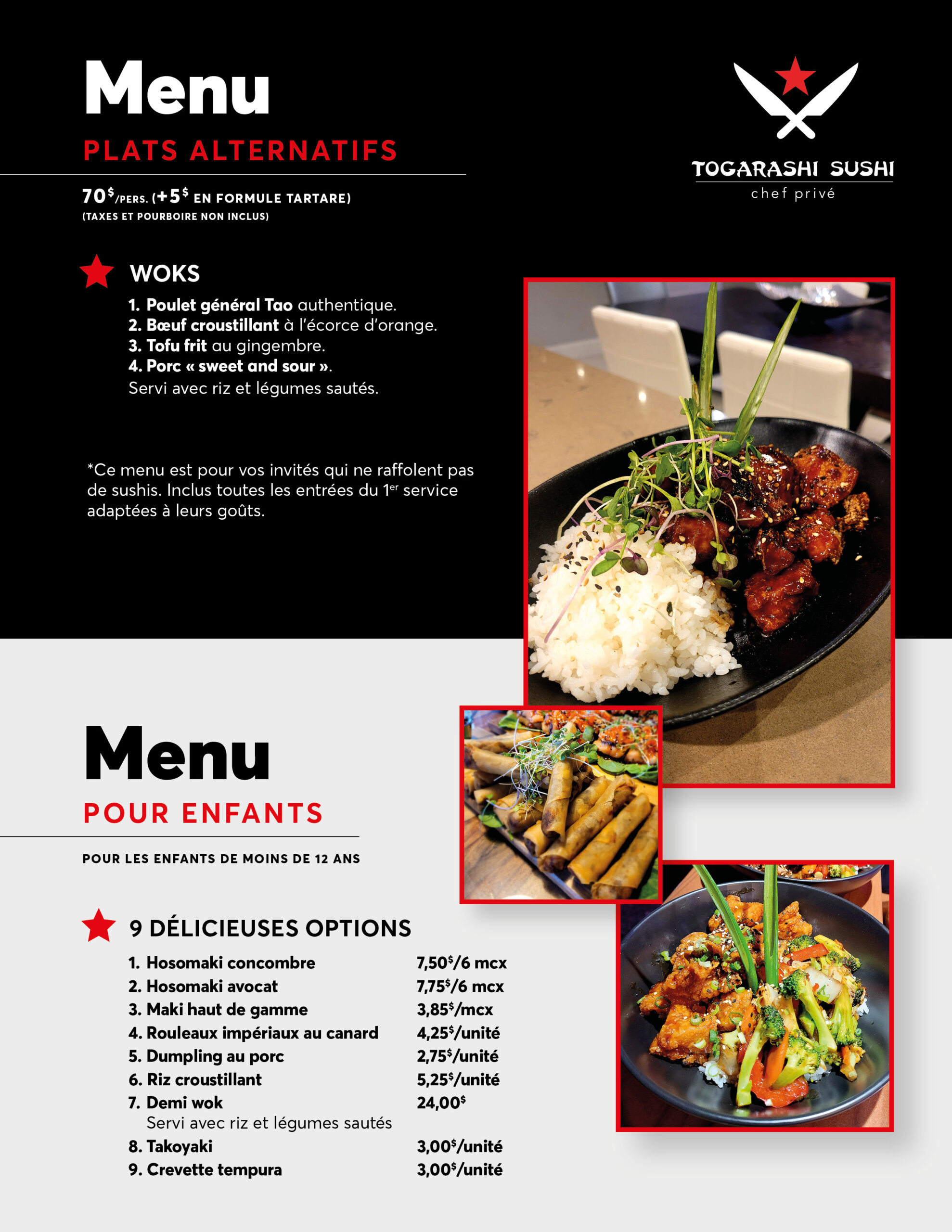 Togarashi Sushi est un service de Chef à domicile haut de gamme vous proposant des soirées sushis fait à partir de produits d’exceptions. Homard frais du jour, saumon canadien, thon Bluefin, crabe des neiges et pétoncles géants font parti de l’éventail de produits qui vous seront proposés. La conception du menu se fait avec vous et selon vos goûts.
